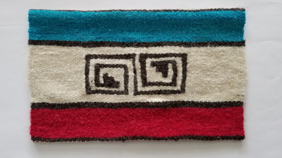 Welcome the Stranger. Hand-spun, natural and hand-dyed churro yarn, cotton warp. The center symbol is a recreation of those found throughout the American Southwest and represents migration —whether forced or voluntary. The red represents the cost of migration, the blue at the top the hope for a new life. It’s inspired by my despair over the current immigration actions by this government. It also reminds me of a flag. 7×12 inches. From the Symbols Tell the Story series. 2018. SOLD